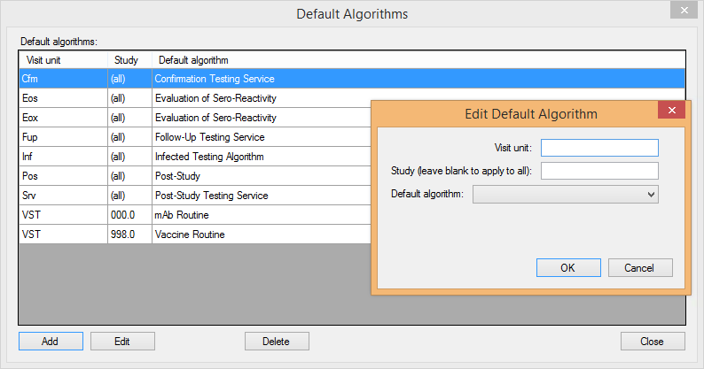 Note: Specifying a Study value allows for the ability to, for the same visit type, use Algorithm A for one study and Algorithm B for another study. Alternatively, you can leave Study blank which will allow the algorithm assignment to be applied to all studies without a specific algorithm assignment.