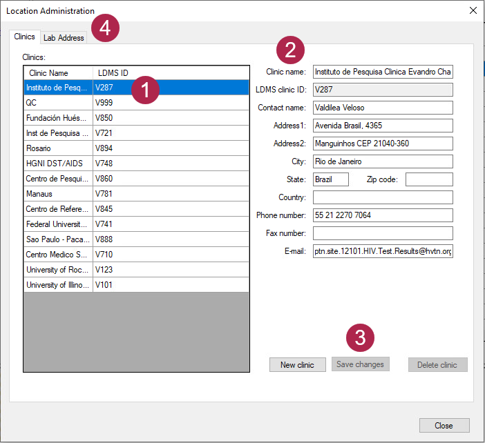 Figure: The Location Administration window. (1) clinics already added to HAWS, (2) information for selected clinic, (3) save changes to selected clinic, (4) view and edit address of current lab