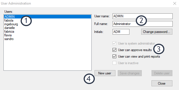 Figure: The User Administration window. (1) existing users, (2) information for currently selected user, (3) permissions for currently selected user, (4) create a new user