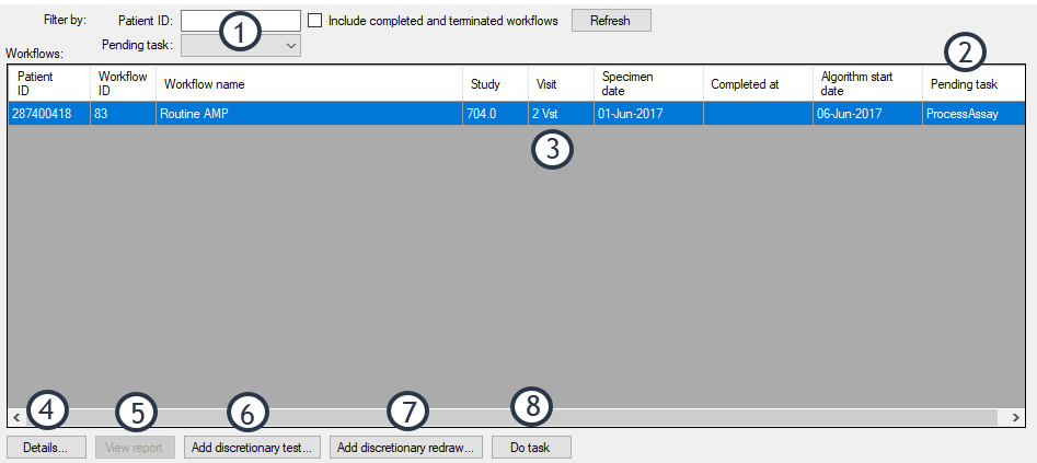 Figure: The view all workflows task. (1) filter workflows that are displayed, (2) next task to be completed for the workflow, (3) workflows meeting filter criteria, (4) view or approve selected workflow, (5) generate (or re-generate) final workflow report, (6) add a new discretionary test to the selected workflow, (7) add a new discretionary redraw to the selected workflow, (8) complete the next task for the selected workflow