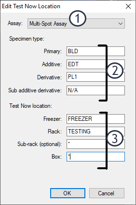 Figure: The Edit Test Now Location window. (1) assay to be assigned, (2) type of specimens to be assigned assay,