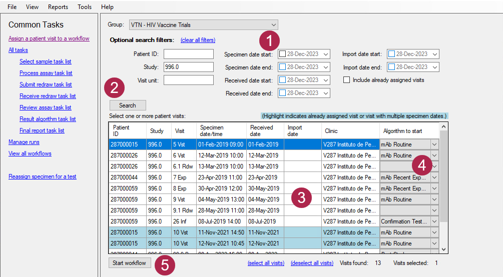 Figure: The assign a patient visit to workflow task. (1) filters for visit search results, (2) search for visits meeting search criteria, (3) visits that meet search criteria, (4) algorithm to use for newly created workflows, (5) create new workflow for selected visits